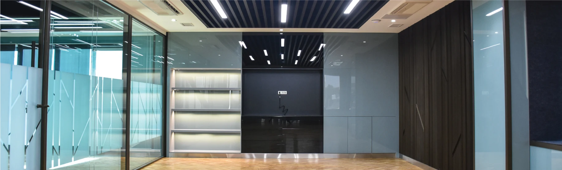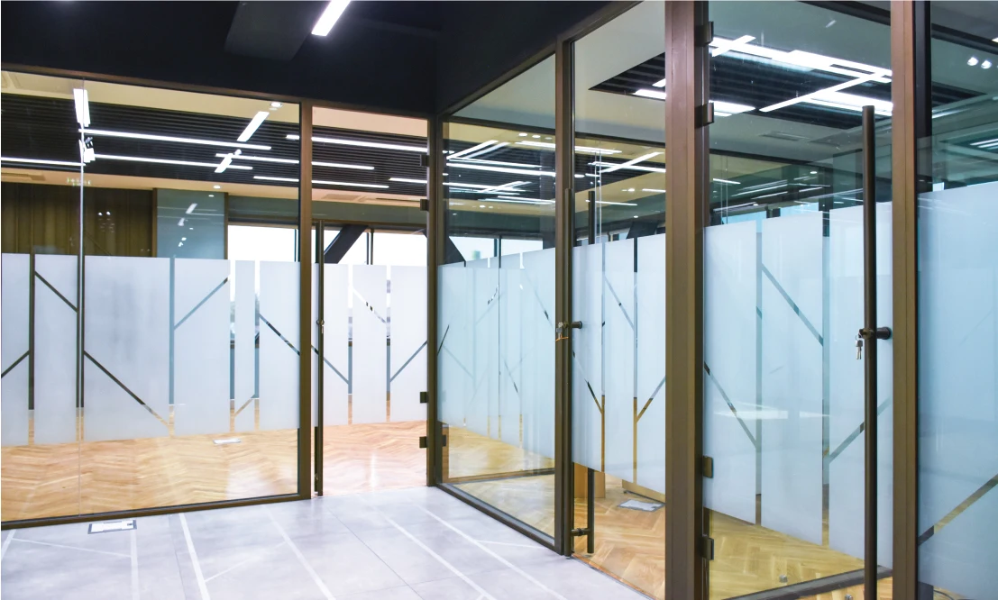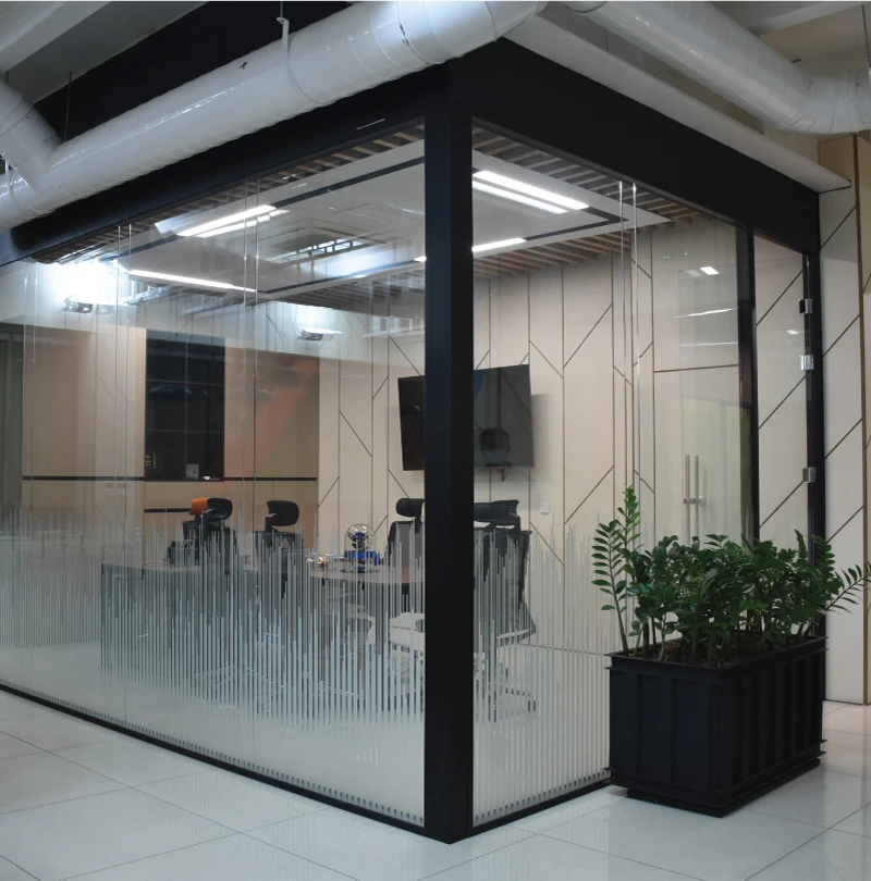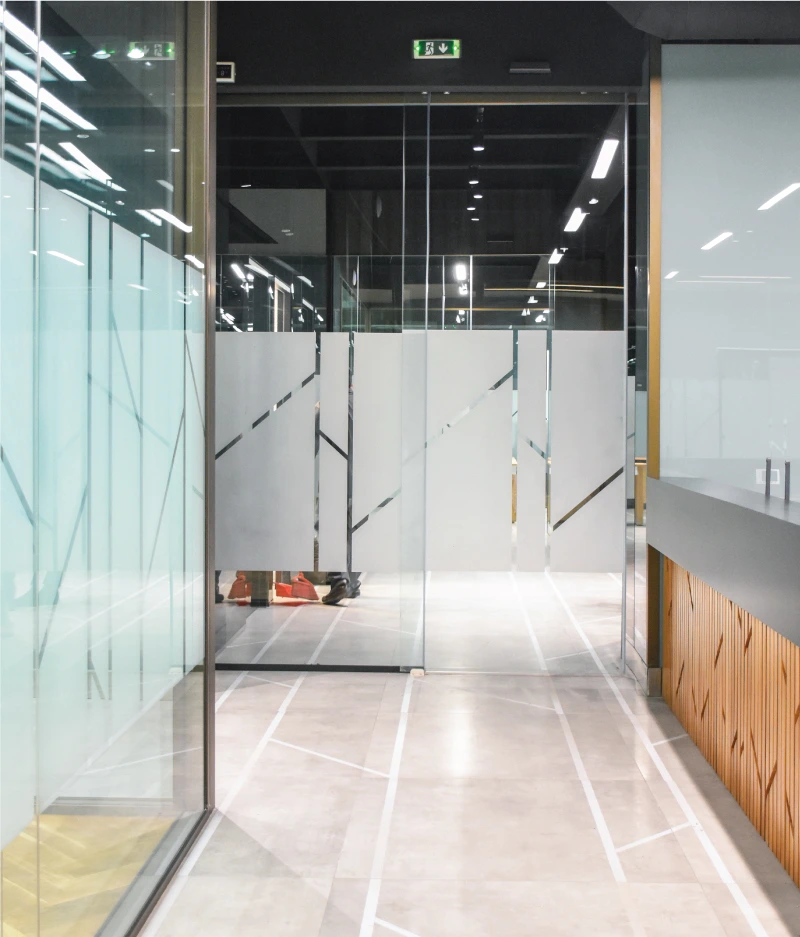 در طراحی داخلی این مجموعه از پارتیشنهای شیشهای با پوشش سندبلاست و طرحهای هندسی استفاده شده که هم حریم خصوصی را حفظ میکنند و هم شفافیت و نور طبیعی را در فضا جاری نگه میدارند.