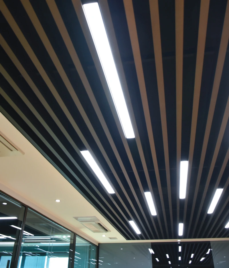 سقف با لوورهای آلومینیومی شامپاینی رنگ طراحی شده که علاوهبر ایجاد جلوهای مدرن، به بهبود آکوستیک فضا نیز کمک میکند. نورپردازی خطی مدرن در میان این لوورها قرار گرفته تا روشنایی یکنواخت و چشمنوازی را فراهم کند.
