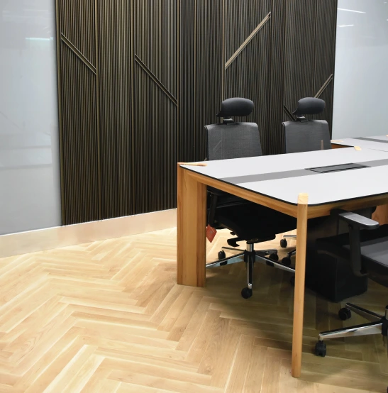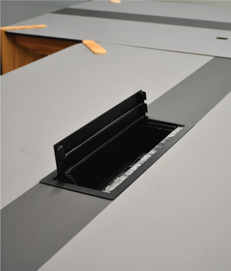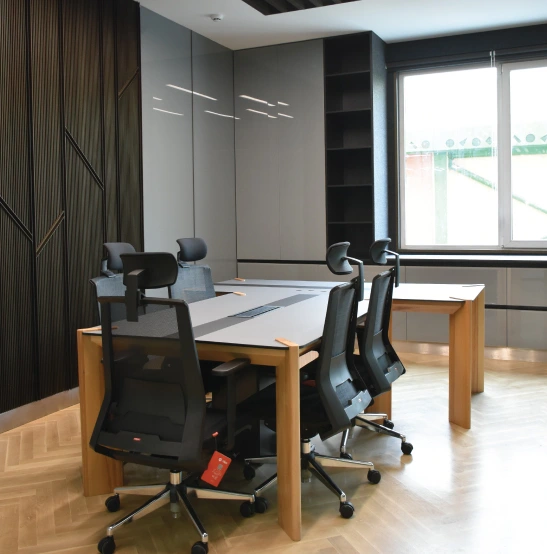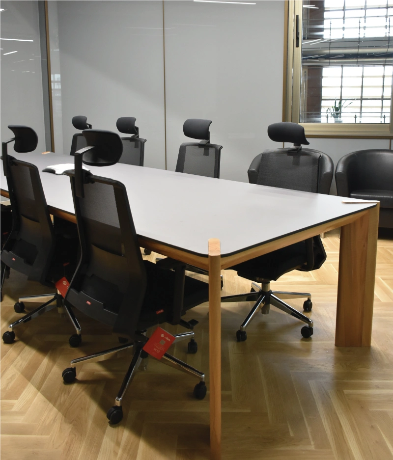 میز کنفرانس نیز با الهام از طراحی یکپارچه و ساده، به گونه‌ای ساخته شده که ضمن ایجاد تمرکز در جلسات، از نظر بصری با فضای اطراف هماهنگ باشد. این میز ظرفیت تعداد مناسبی از شرکت‌کنندگان را دارد و به لحاظ فنی، امکاناتی همچون داکت‌های عبور کابل، خروجی برق و فضای نصب تجهیزات صوتی تصویری را در خود جای داده است.