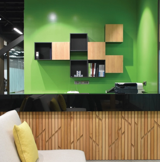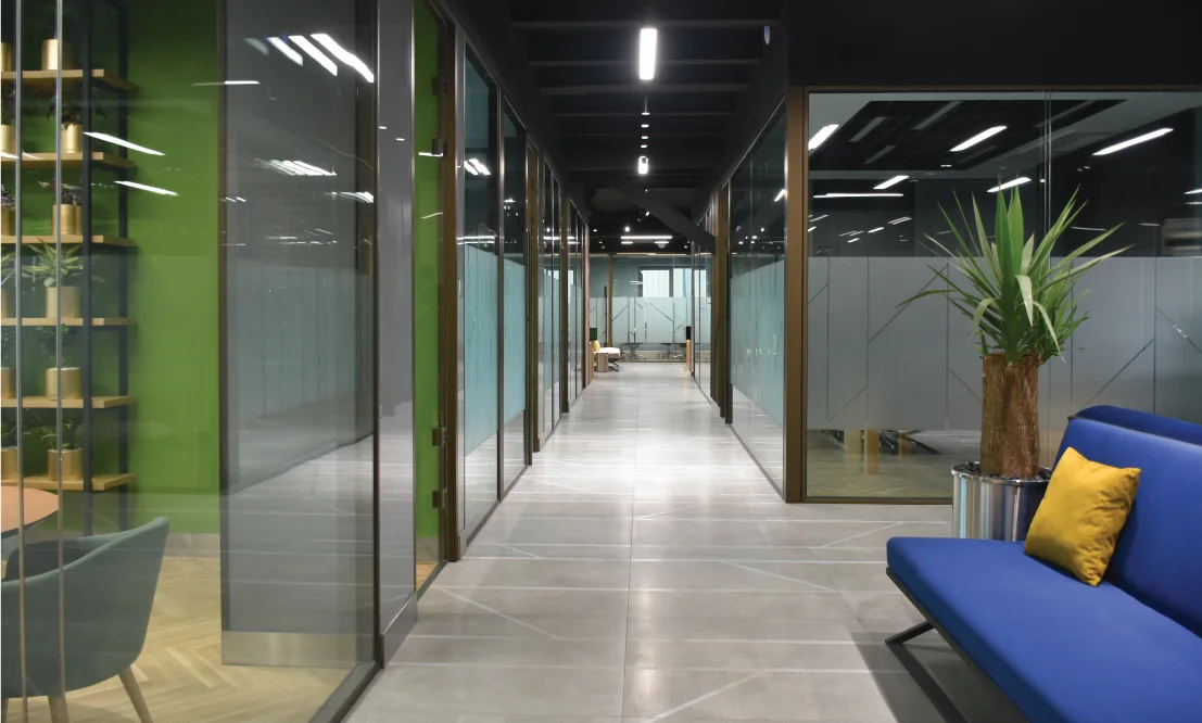 این پارتیشن‌ها با استفاده از شیشه سکوریت شفاف و سندبلاست‌شده، مرز میان فضاهای کاری را بدون ایجاد حس جدایی مشخص کرده‌اند. حضور نور طبیعی در تمامی بخش‌ها، به لطف این جداسازی شفاف، موجب افزایش بهره‌وری، ایجاد حس پویایی و بهبود ارتباط میان تیم‌ها شده است.